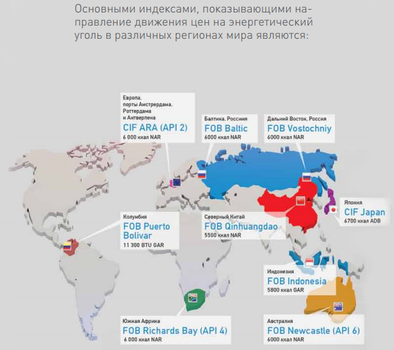 Мировые цены на уголь носят региональный характер и значительно различаются в разных регионах мира в связи с различным балансом локального спроса и предложения, стоимости доставки до покупателей, а также требованиями к калорийности угля. Тем не менее, их общая динамика соответствует мировой.