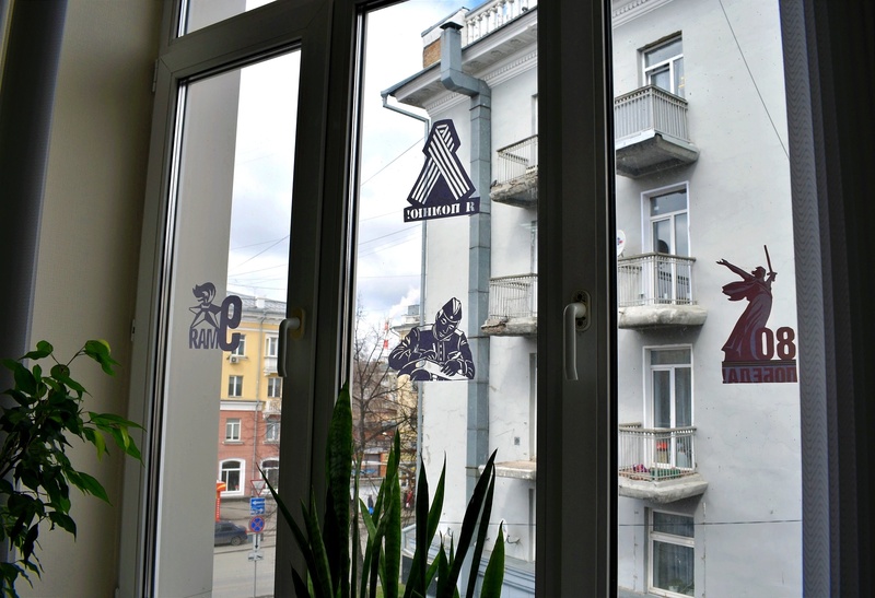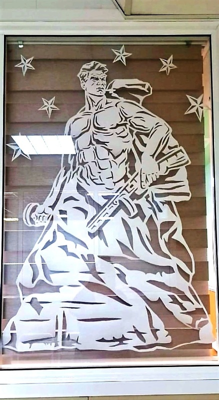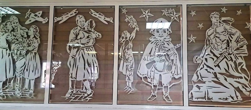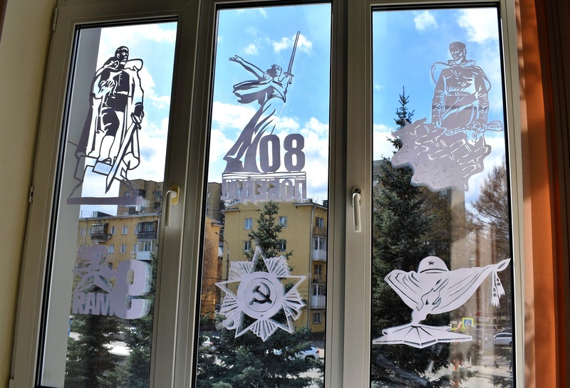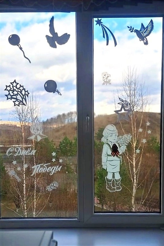 В окнах главного офиса в городе Кемерово и в административно-бытовом комплексе разреза «Виноградовский» в Беловском районе сотрудники предприятий разместили ажурные трафареты с символикой Великой Победы. Фигуры солдатов, контуры знаменитых памятников и монументов России, символы мира и вечной памяти погибших в сражениях 1941-1945 годов (голуби, журавли и вечные огни) украсили фасады зданий и создали внутри офисов предпраздничную атмосферу.