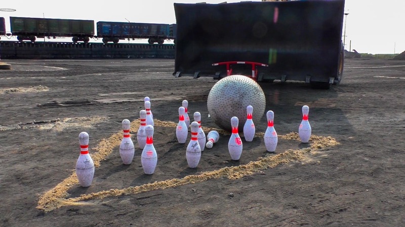 На третьем этапе, зажав «вилами» погрузчика мячик, следует проехать между фишками и забить этот мяч в баскетбольное кольцо. Далее – выбить этим же мячом кегли.
